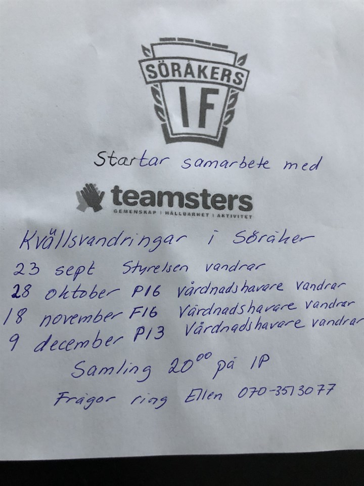 Vi kommer att börja samarbeta med Teamsters som arrangerar vandringar i Timrå. Uppdraget är att synas och finnas och göra det tryggt för våra ungdomar i Söråker. Vi samlas på IP kl 20 för att bestämma hur vi går. Vi avslutar vid 01 tiden. Före jul har vi fyra tillfällen, i november månad kommer det bli ett möte där vårterminens organisationen kommer att styras upp tillsammans med Teamsters. Vi tror det är bra om vi är 5 st varje gång,då kan man turas om inom laget. 28/10 P16 18/11 F16 9/12 P13 Tillsammans ska vi jobba för ett tryggt Söråker för våra ungdomar genom att visa att vi finns och bryr oss om. Mvh Ellen Persson på uppdrag av föreningen Söråkers IF 18 sep 2022 0kommentarer