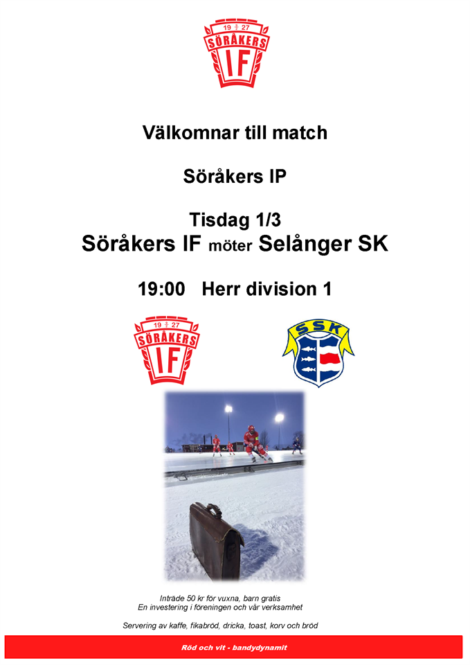 På tisdag den 1 mars kl 19:00 möter herrarna SSK hemma på IP! Vi hoppas på mycket folk som kommer och hejar fram vårt lag som kämpat på under vintern! Välkomna!! Söråkers IF 27 feb 2022 0kommentarer