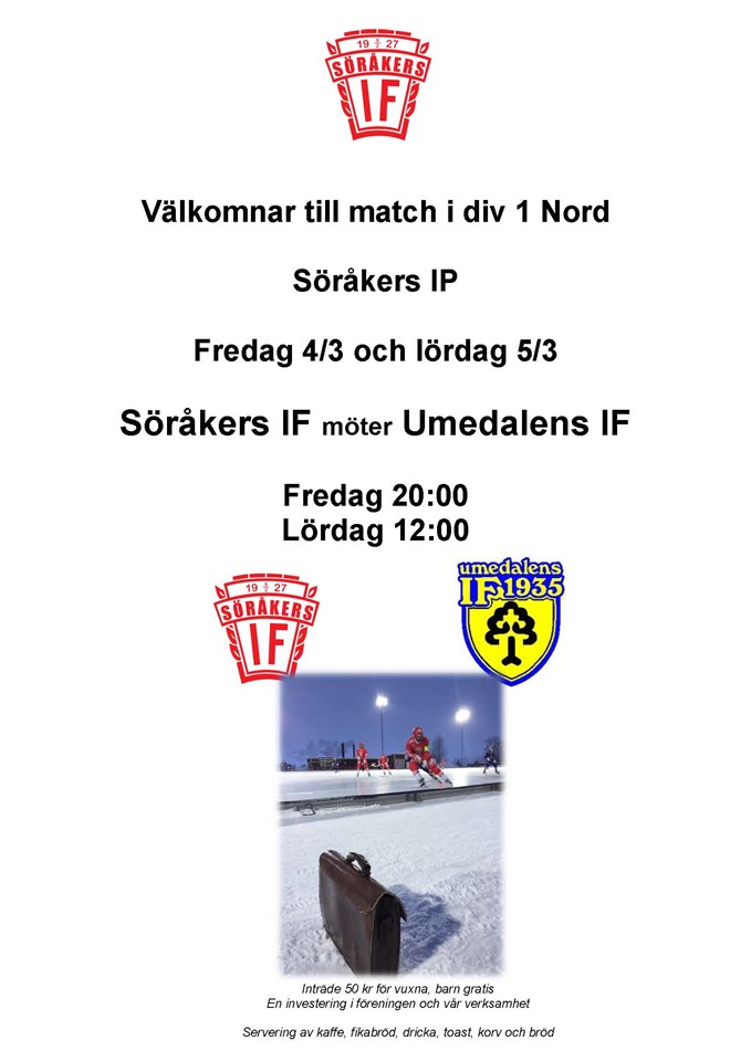 Idag fredag möter herrarna Umedalens IF hemma på Söråkers IP kl 20:00 och imorgon lördag tar vi returmötet kl 12:00. Sista matcherna för herrarna den här säsongen. Damerna spelar sin sista match borta på lördag mot Uppsala. På söndag är det avslutning för skridskoskolan kl 10:30 och P15 drar till Ljusdal för matcher. Varmt välkomna! Söråkers IF 4 mar 2022 0kommentarer