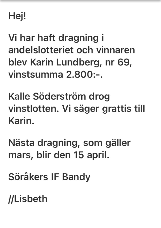 Hej! Vi har haft dragning för Mars 2021 och vinnaren blev Madelene Thunfors, lottnr 21, vinstsumma 2800:-. Petrus Andersson drog vinstlotten. Nästa dragning sker i mitten av maj 2021 och gäller april månad. Söråkers IF 15 apr 2021 0kommentarer