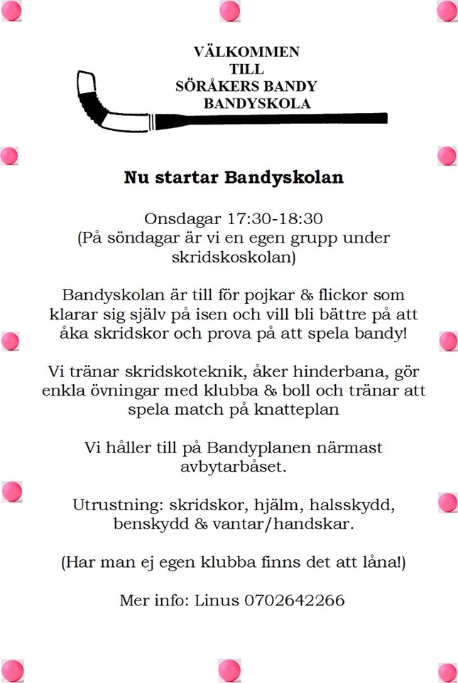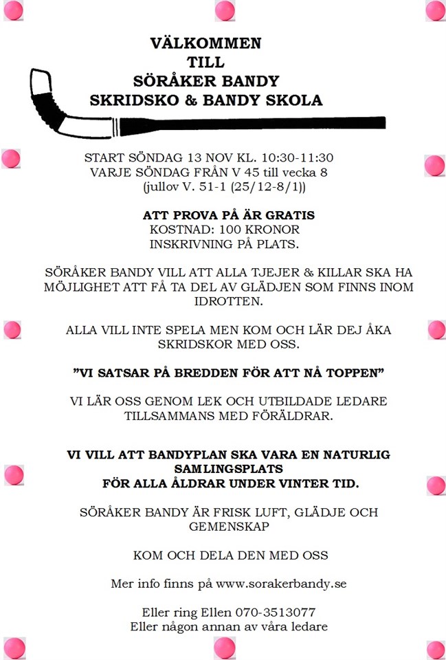 START SÖNDAG 13 NOV KL. 10:30-11:30 VARJE SÖNDAG FRÅN V 45 till vecka 8 (jullov V. 51-1 (25/12-8/1)) ATT PROVA PÅ ÄR GRATIS KOSTNAD: 100 KRONOR INSKRIVNING PÅ PLATS. SÖRÅKER BANDY VILL ATT ALLA TJEJER & KILLAR SKA HA MÖJLIGHET ATT FÅ TA DEL AV GLÄDJEN SOM FINNS INOM IDROTTEN. ALLA VILL INTE SPELA MEN KOM OCH LÄR DEJ ÅKA SKRIDSKOR MED OSS. Söråkers IF 8 nov 2016 0kommentarer