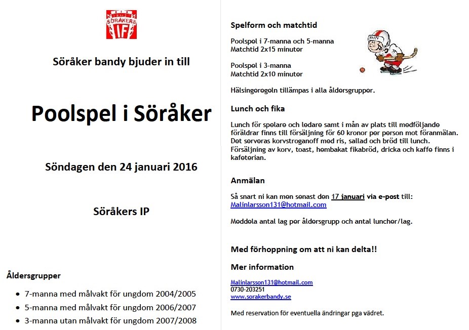 Söråker bandy bjuder in till Poolspel i Söråker Söndagen den 24 januari 2016 Söråkers IP Åldersgrupper • 7-manna med målvakt för ungdom 2004/2005 • 5-manna med målvakt för ungdom 2006/2007 • 3-manna utan målvakt för ungdom 2007/2008 Spelform och matchtid Poolspel i 7-manna och 5-manna Matchtid 2x15 minuter Poolspel i 3-manna Matchtid 2x10 minuter Hälsingeregeln tillämpas i alla åldersgrupper. Lunch och fika Lunch för spelare och ledare samt i mån av plats till medföljande föräldrar finns till försäljning för 60 kronor per person mot föranmälan. Det serveras korvstroganoff med ris, sallad och bröd till lunch. Försäljning av korv, toast, hembakat fikabröd, dricka och kaffe finns i kafeterian. Anmälan Så snart ni kan men senast den 17 januari via e-post till: Malinlarsson131@hotmail.com Meddela antal lag per åldersgrupp och antal luncher/lag. Med förhoppning om att ni kan delta!! Mer information Malinlarsson131@hotmail.com 0730-203251 www.sorakerbandy.se Med reservation för eventuella ändringar pga vädret. Söråkers IF 12 jan 2016 0kommentarer