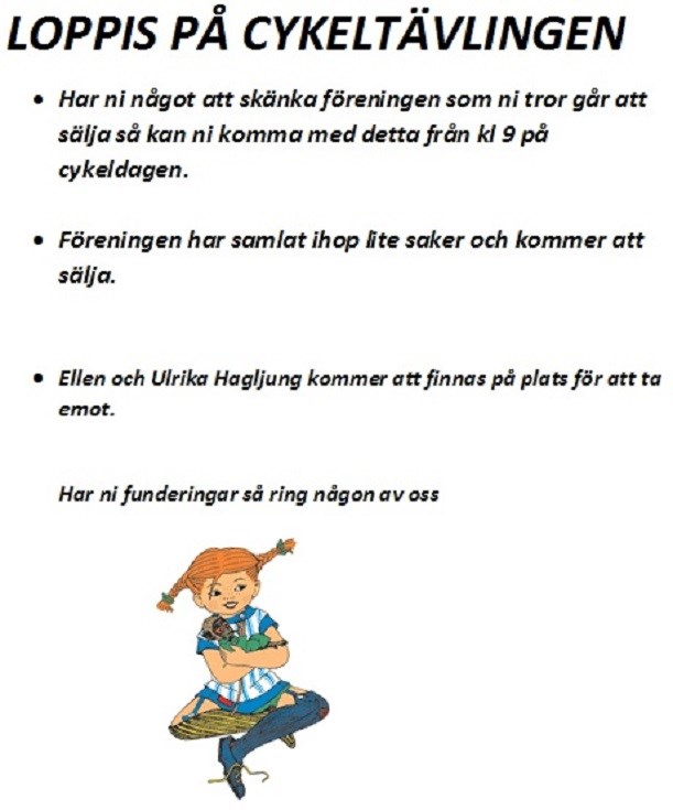• Har ni något att skänka föreningen som ni tror går att sälja så kan ni komma med detta från kl 9 på cykeldagen. • Föreningen har samlat ihop lite saker och kommer att sälja. • Ellen och Ulrika Hagljung kommer att finnas på plats för att ta emot. Har ni funderingar så ring någon av oss Söråkers IF 22 jun 2015 0kommentarer