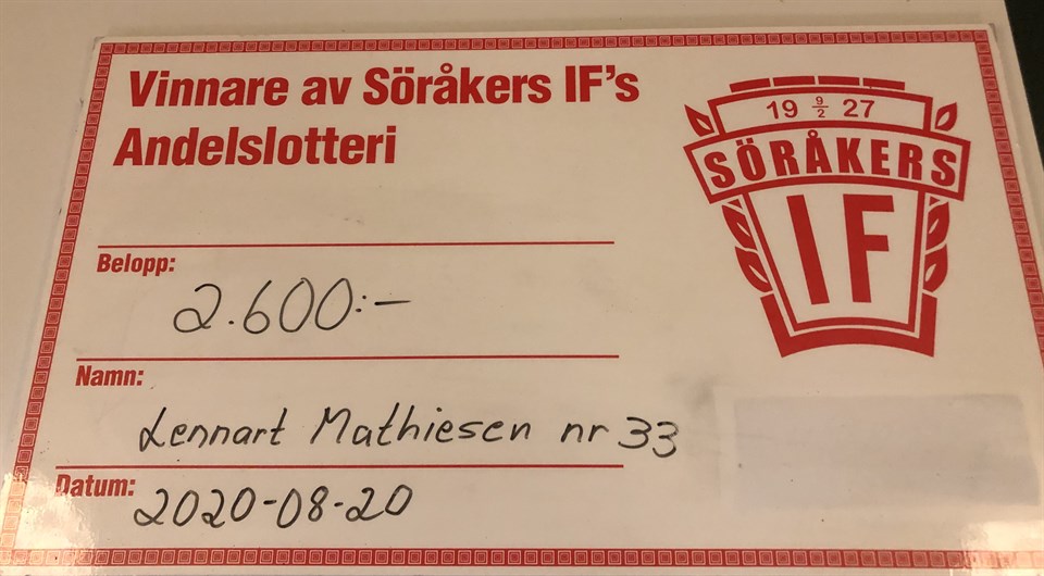 Vi säger grattis till Agneta Oscarsson som med nummer 2 vann 2700kr. Elias Berglund drog vinstlotten , nästa dragning sker den 15/7 och då är det hela summan om Max 10000 kr som står på spel! Kontakta Elisabeth Andersson så hjälper hon till med nummer inför dragningen! Söråkers IF 15 jun 2020 0kommentarer