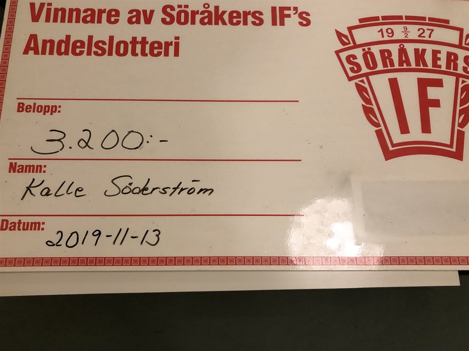 Vi säger grattis till Karl Söderström som blev oktober månads vinnare. Vinstsumman blev denna gång 3200kr. Kontakta Elisabeth Andersson om ni vill delta i andelslotteriet. Söråkers IF 13 nov 2019 0kommentarer